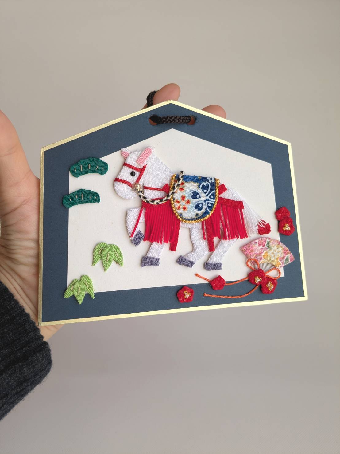 紺色の絵馬型台紙にあしらった壁掛けです。
