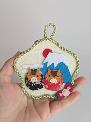 赤黒の桜柄の馬だるまや富士山、お花を押絵を作り