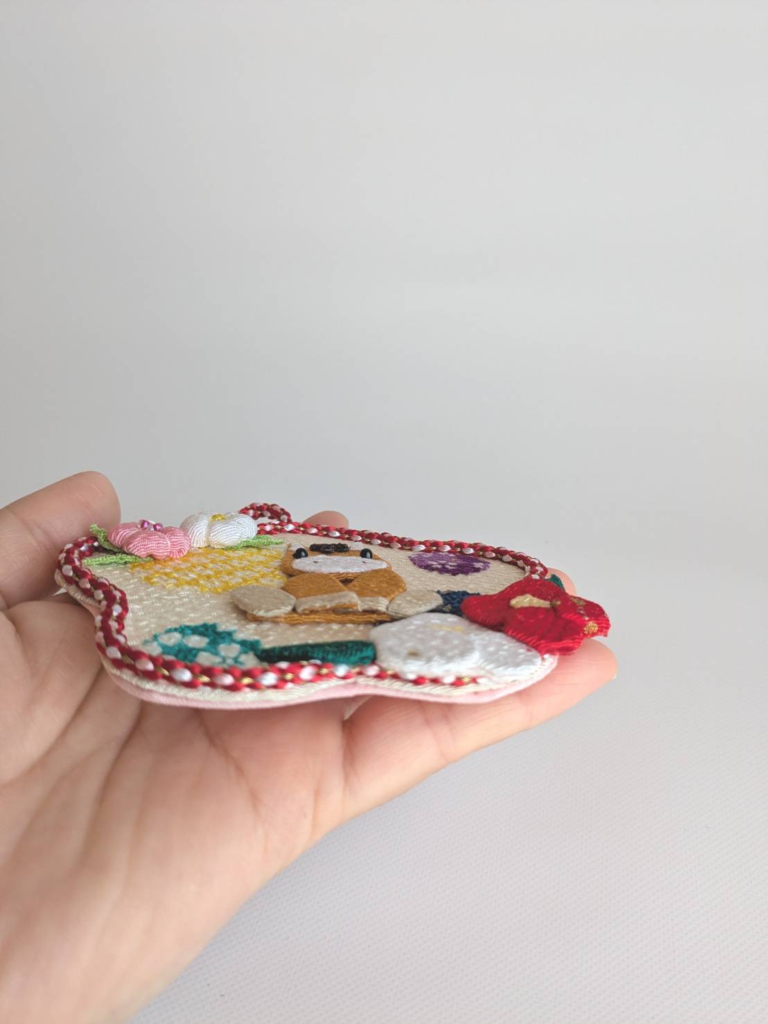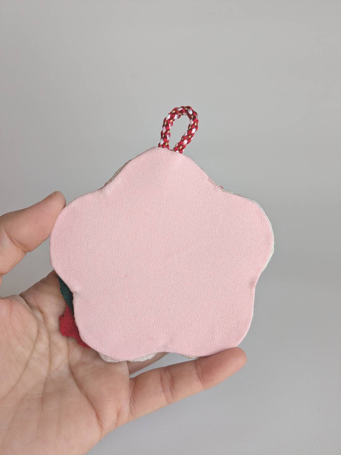 黄緑・白・金色の紐やちりめんを貼った梅型の土台にあしらいました。