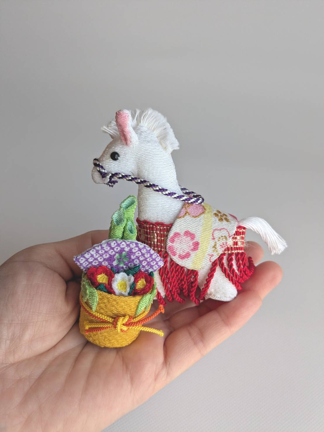 白地のちりめんで午を作り、赤いフリンジと柄ちりめんの鞍を背に乗せました。