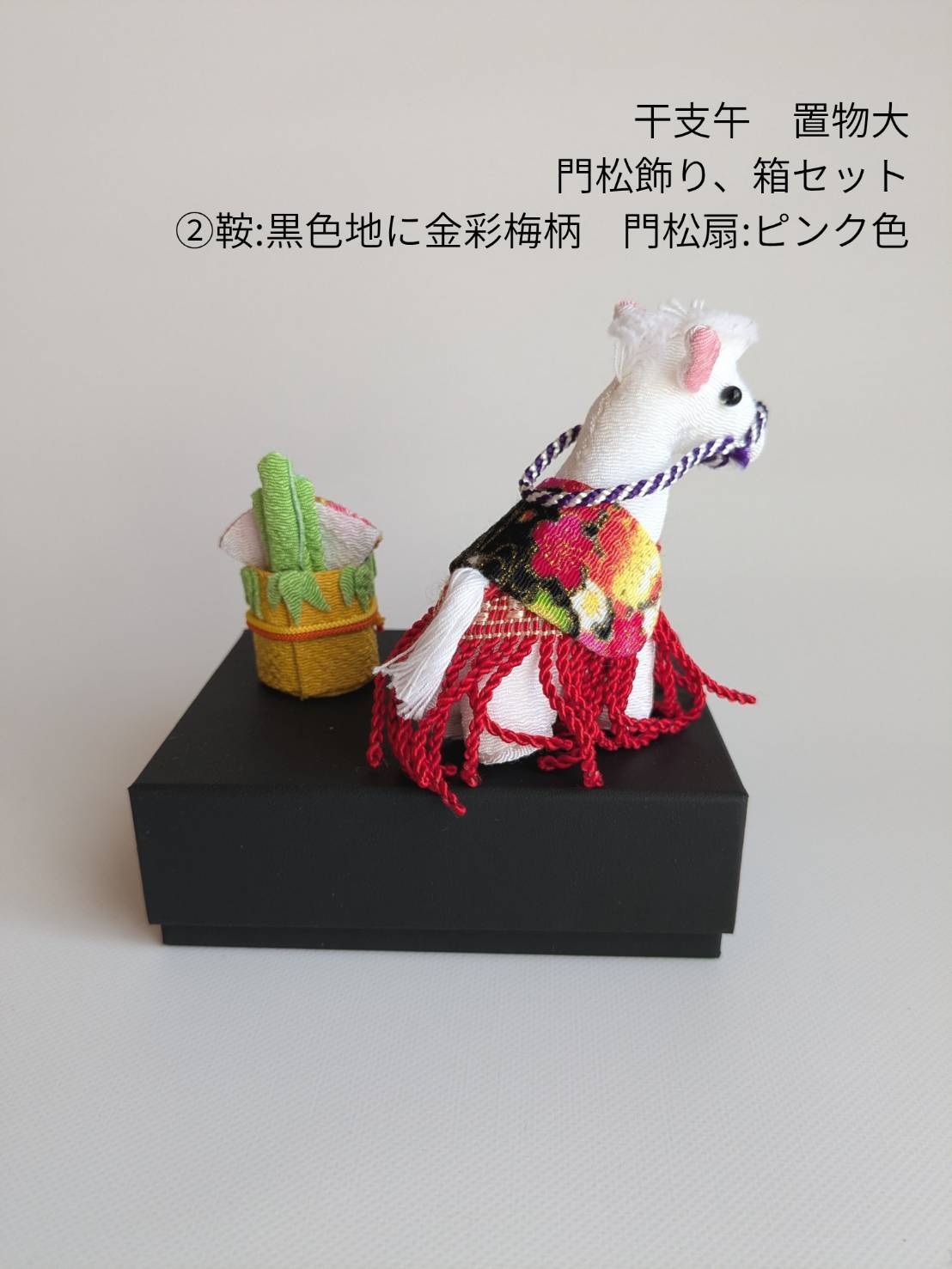 【干支午(うま・馬) 置物大、門松飾り、箱セット ②鞍:黒色地に金彩梅柄 門松扇:ピンク色】