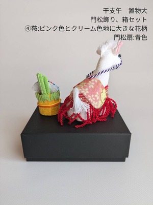 【干支午(うま・馬) 置物大、門松飾り、箱セット ④鞍:ピンク色とクリーム色地に大きな花柄 門松扇:青色】