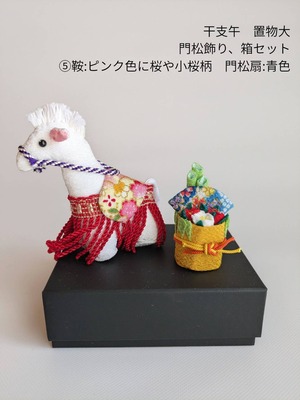【干支午(うま・馬) 置物大、門松飾り、箱セット ⑤鞍:ピンク色に桜や小桜柄 門松扇:青色】