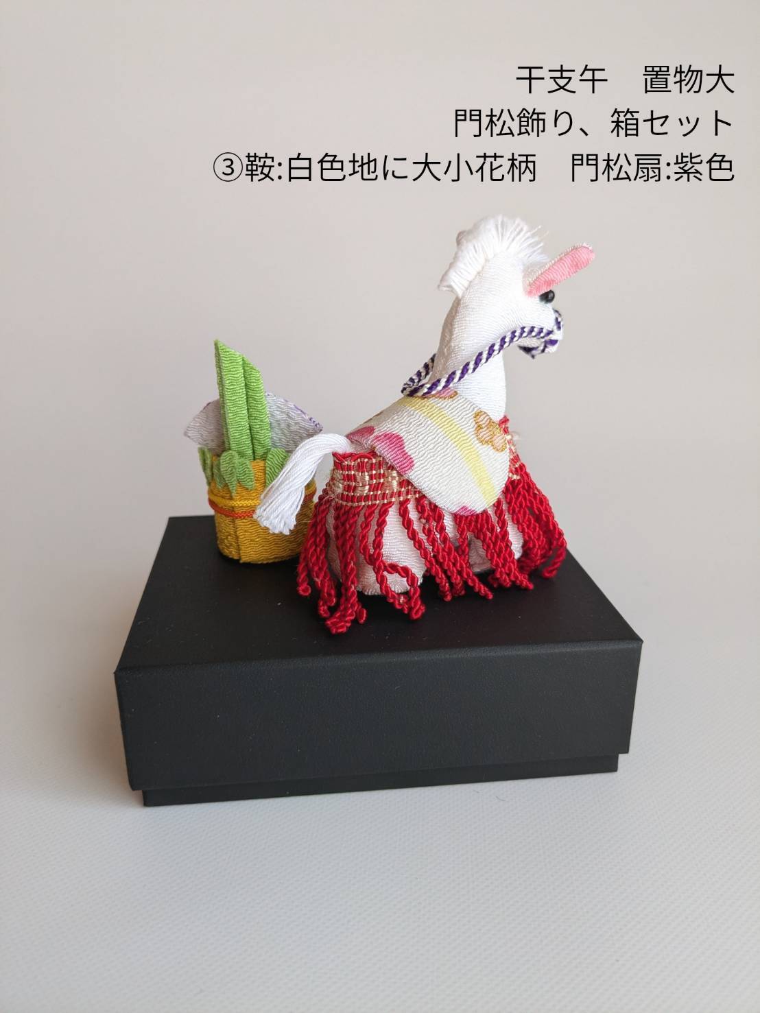 【干支午(うま・馬) 置物大、門松飾り、箱セット ③鞍:白地に大小花柄 門松扇:紫色】