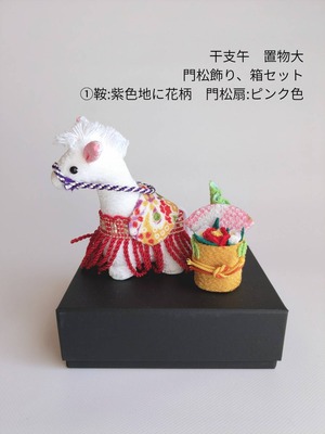 【干支午(うま・馬) 置物大、門松飾り、箱セット ①鞍:紫地に花柄 門松扇:ピンク色 】