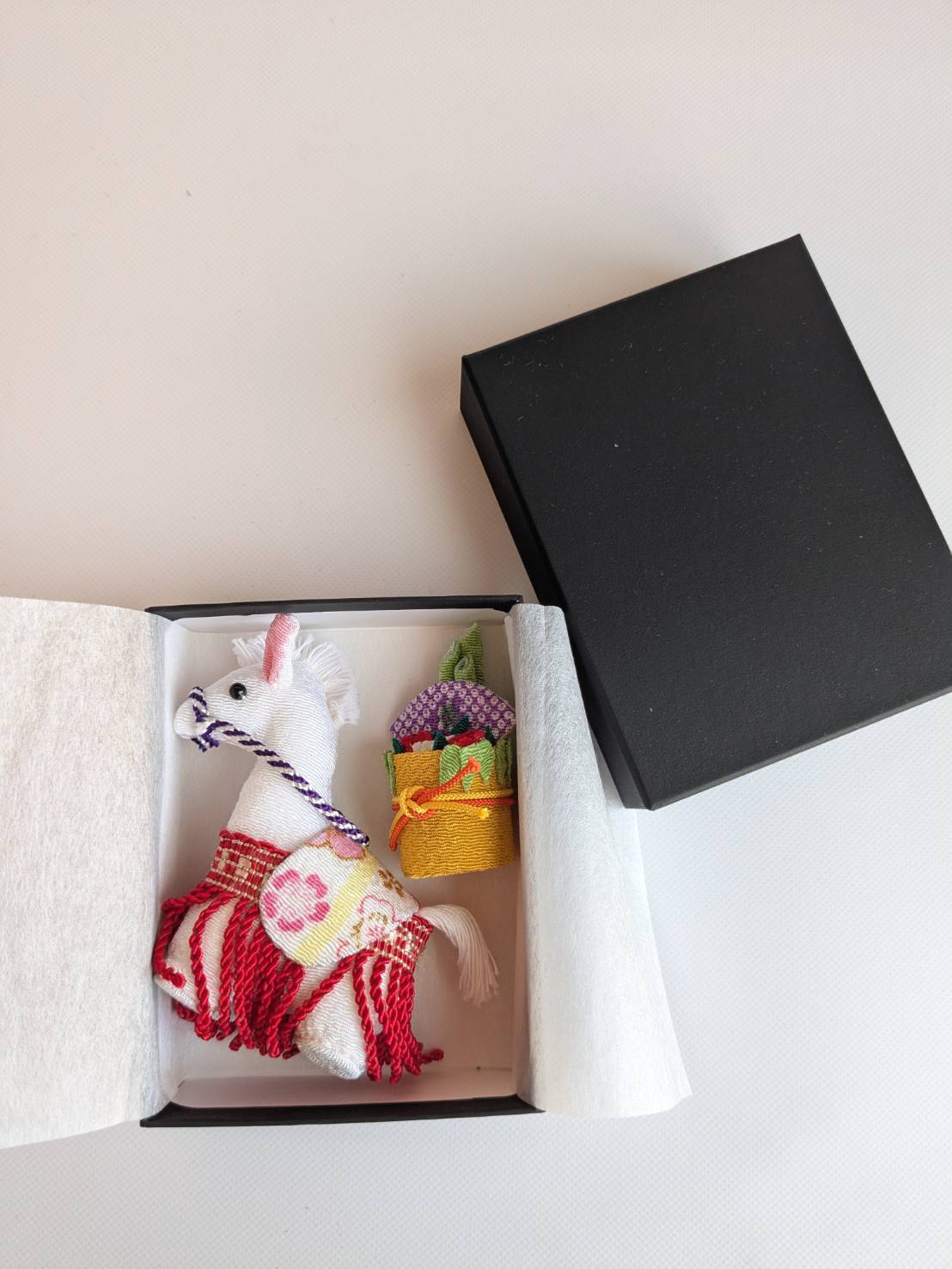 黒箱に午の置物、門松飾りを乗せて飾ってもB7サイズ(パスポートくらい)ほどの場所があれば飾ることができます。