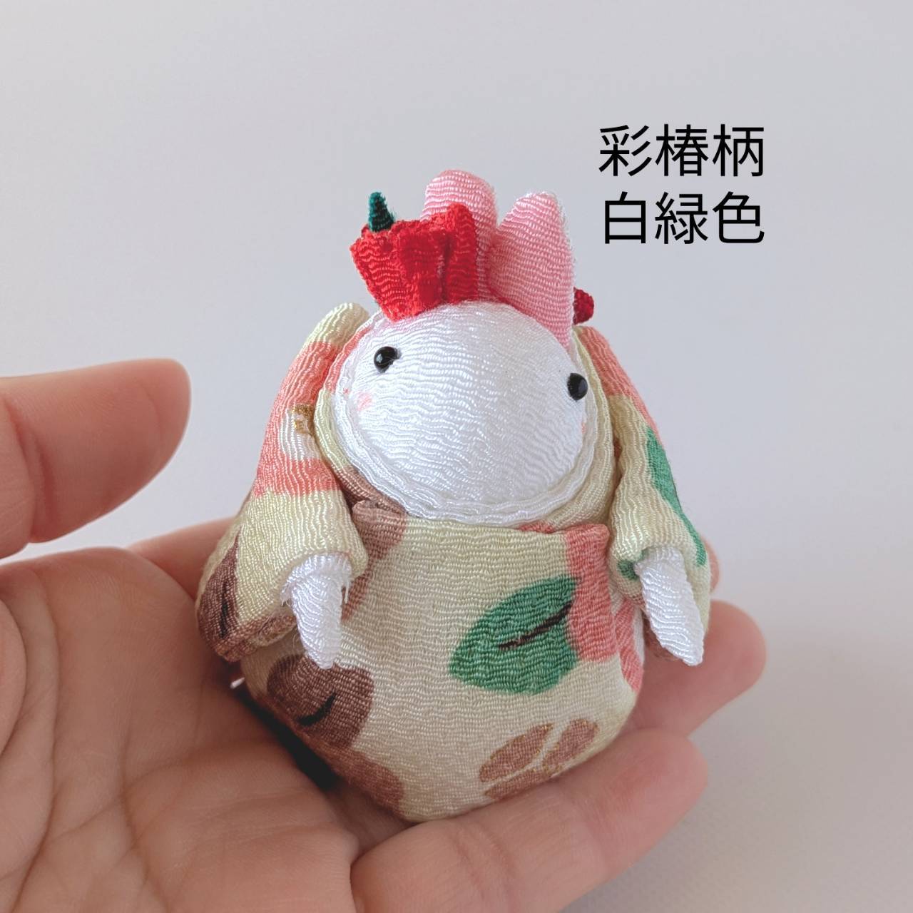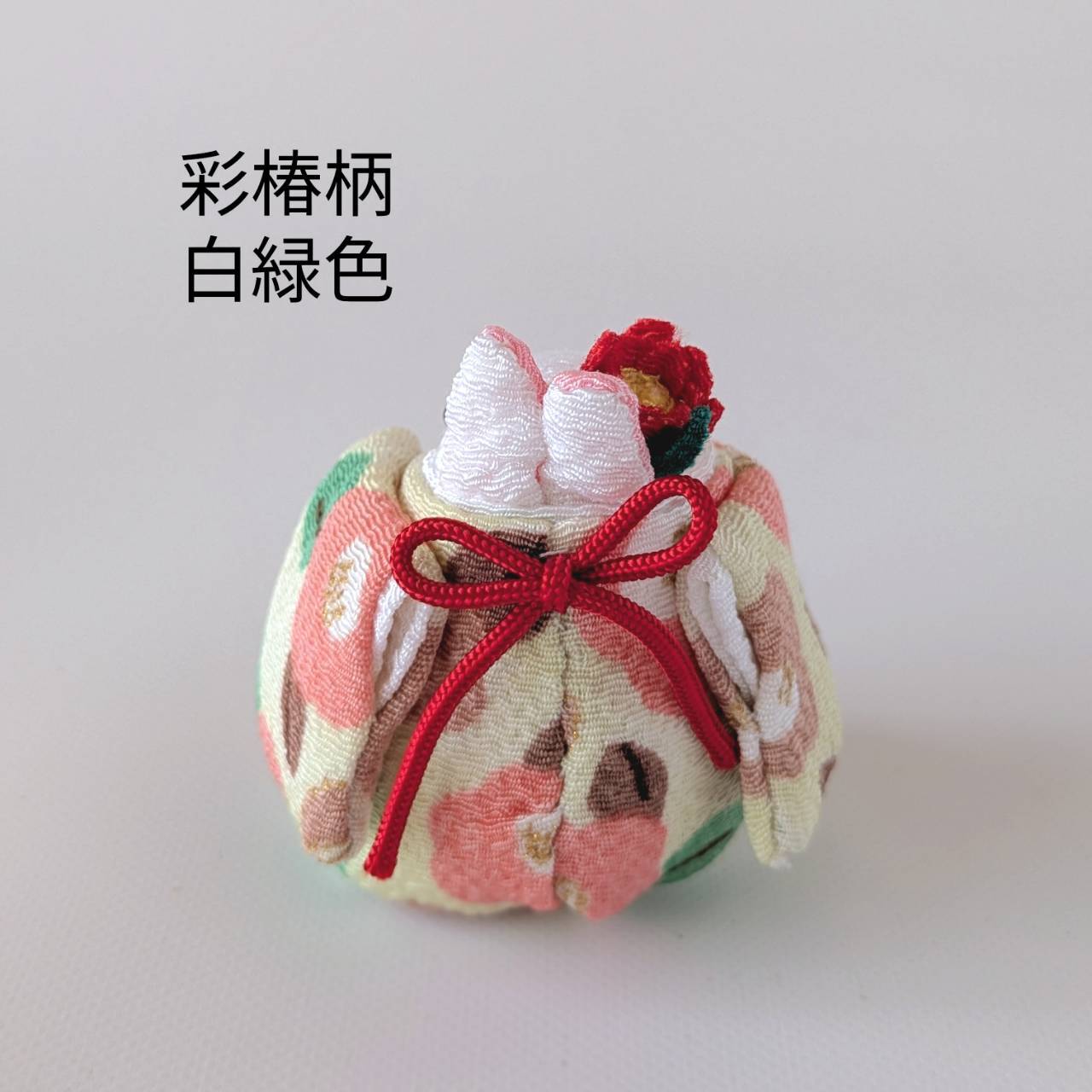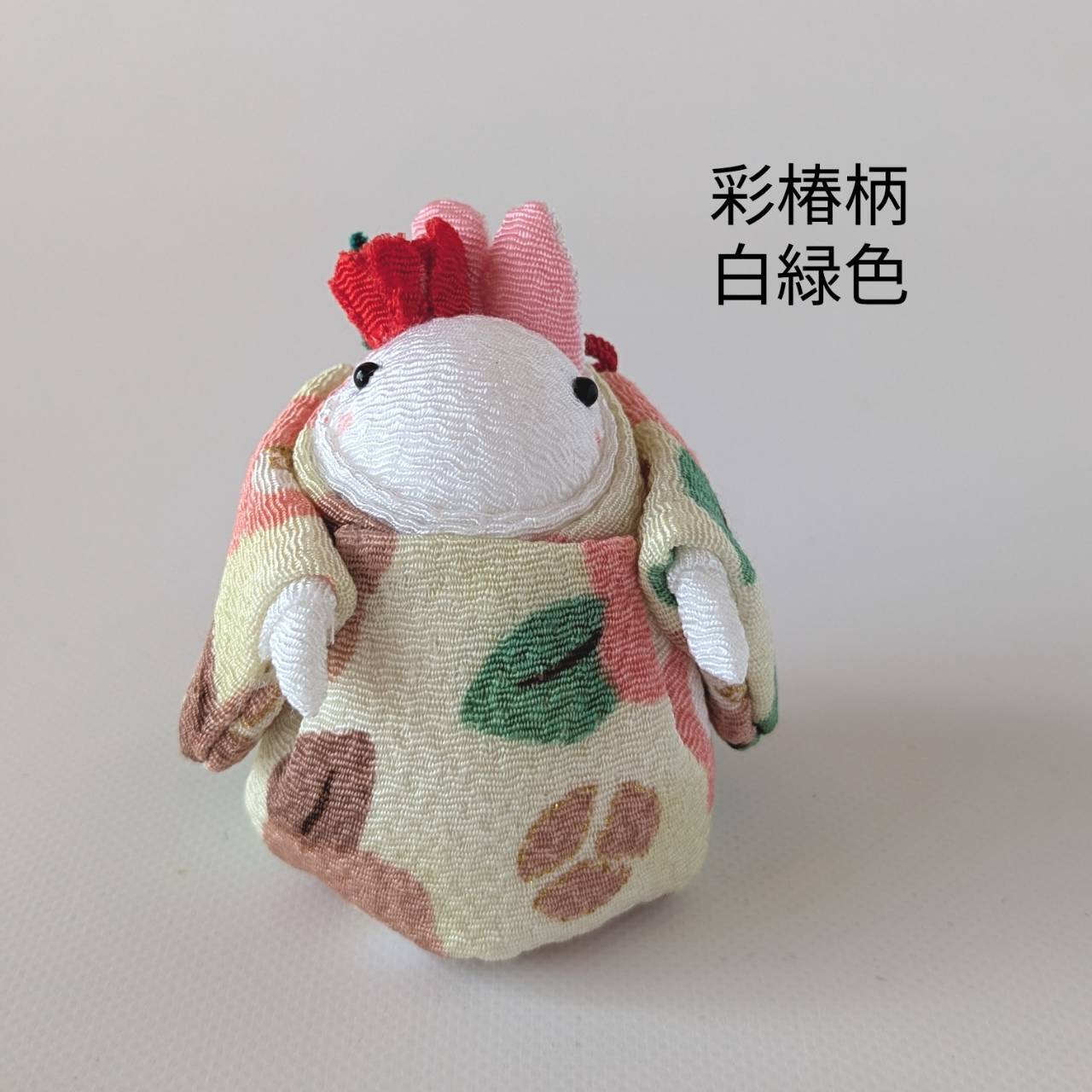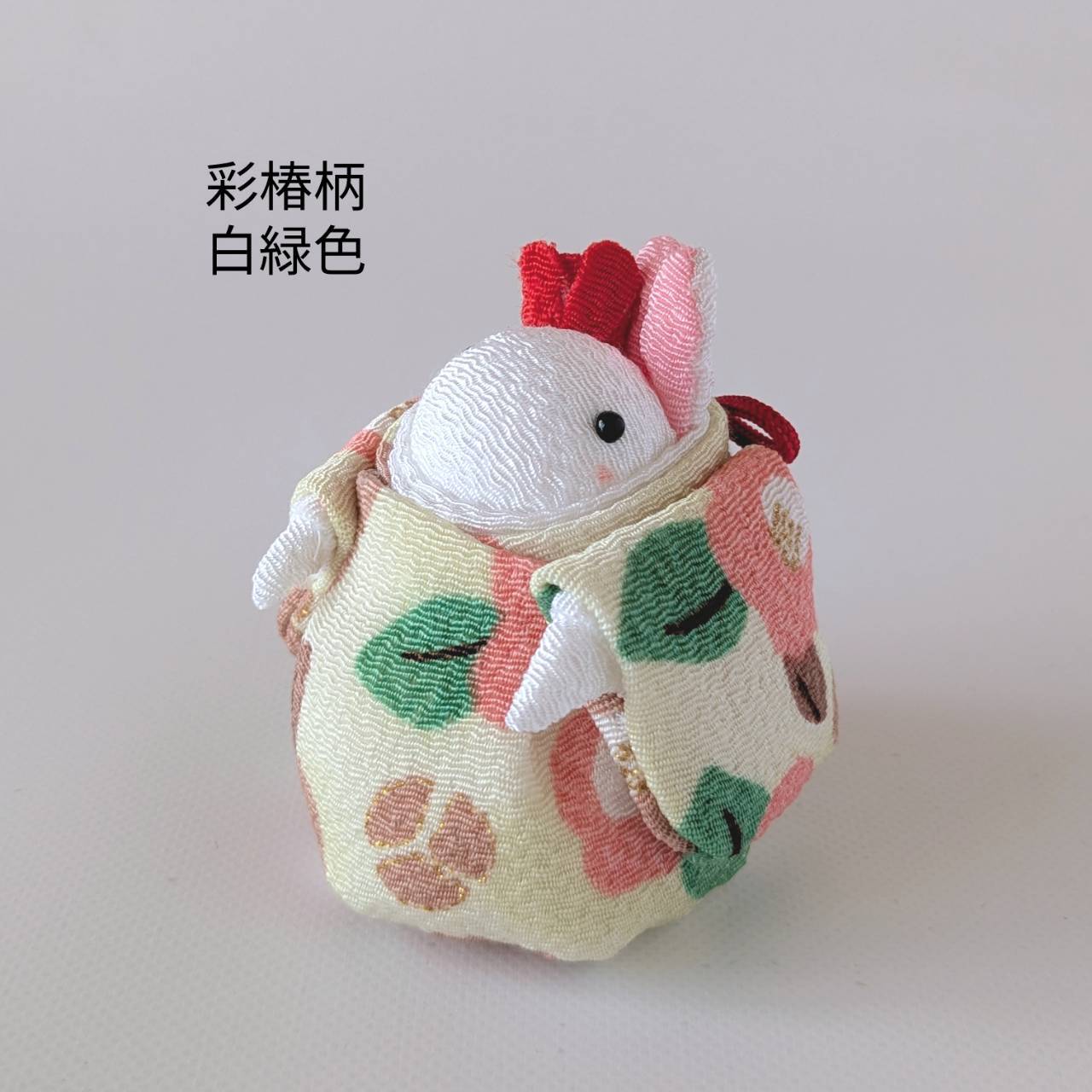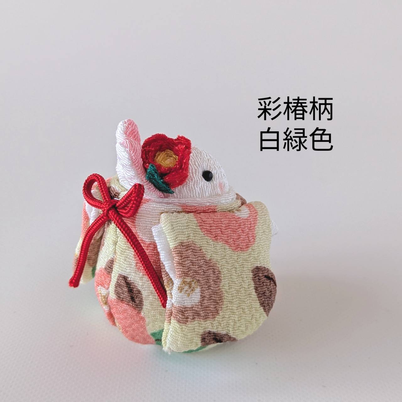 「椿うさちゃん 椿の花飾り ちりめん生地 彩椿柄(白緑色)」