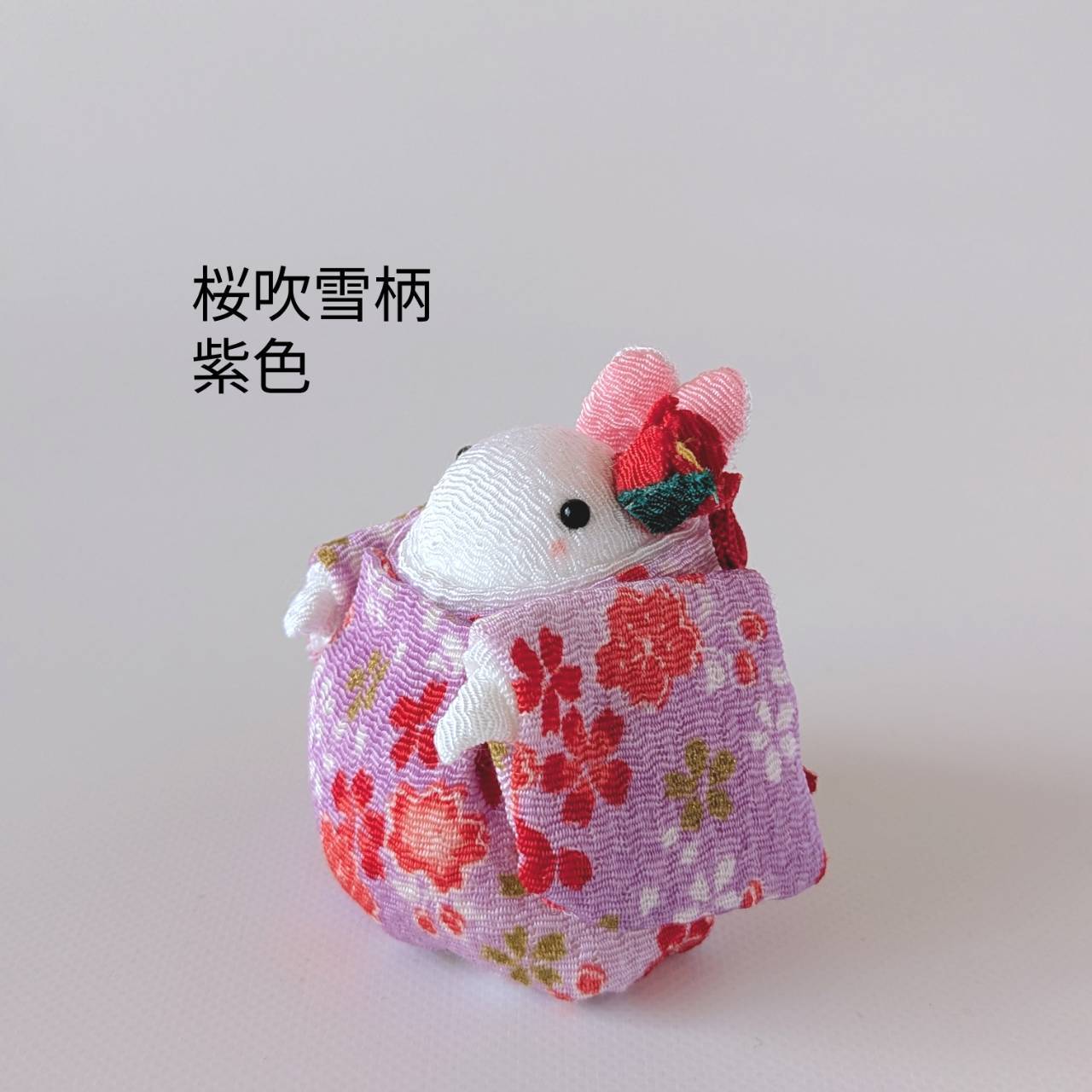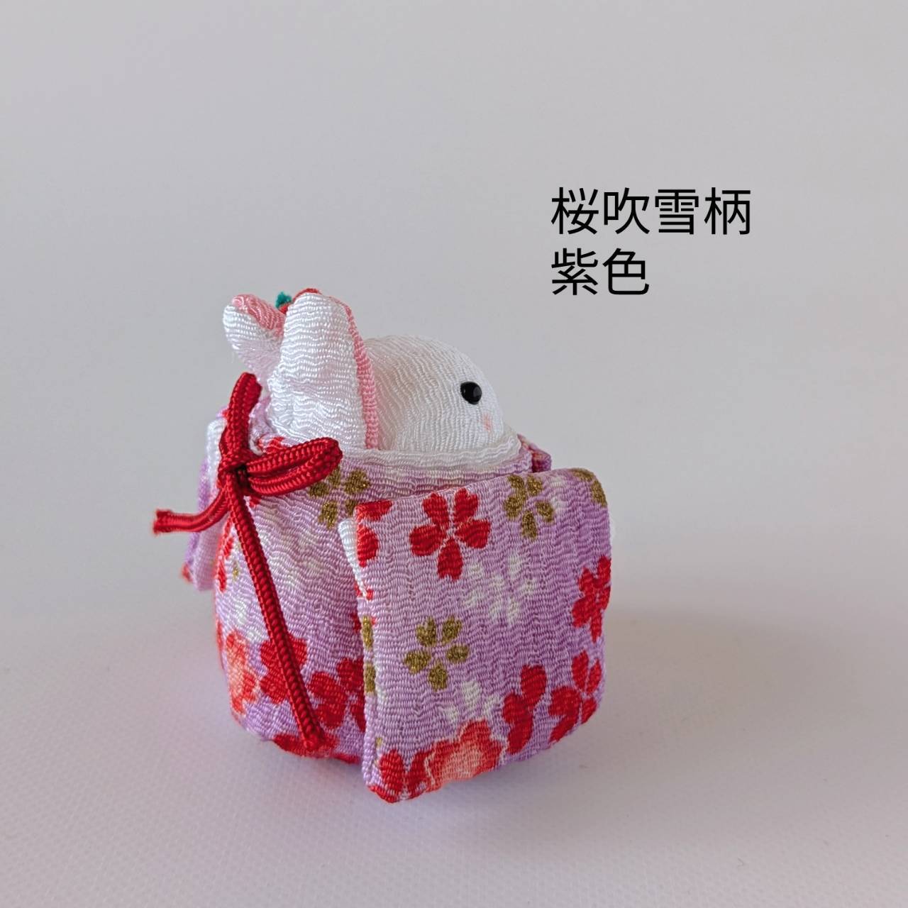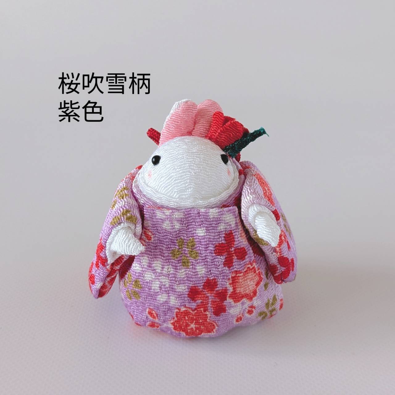 紫地に金彩や赤色、白色の桜が斜めに並んだように描かれた着物を着て頭に赤色の椿の花飾りをつけたうさちゃん