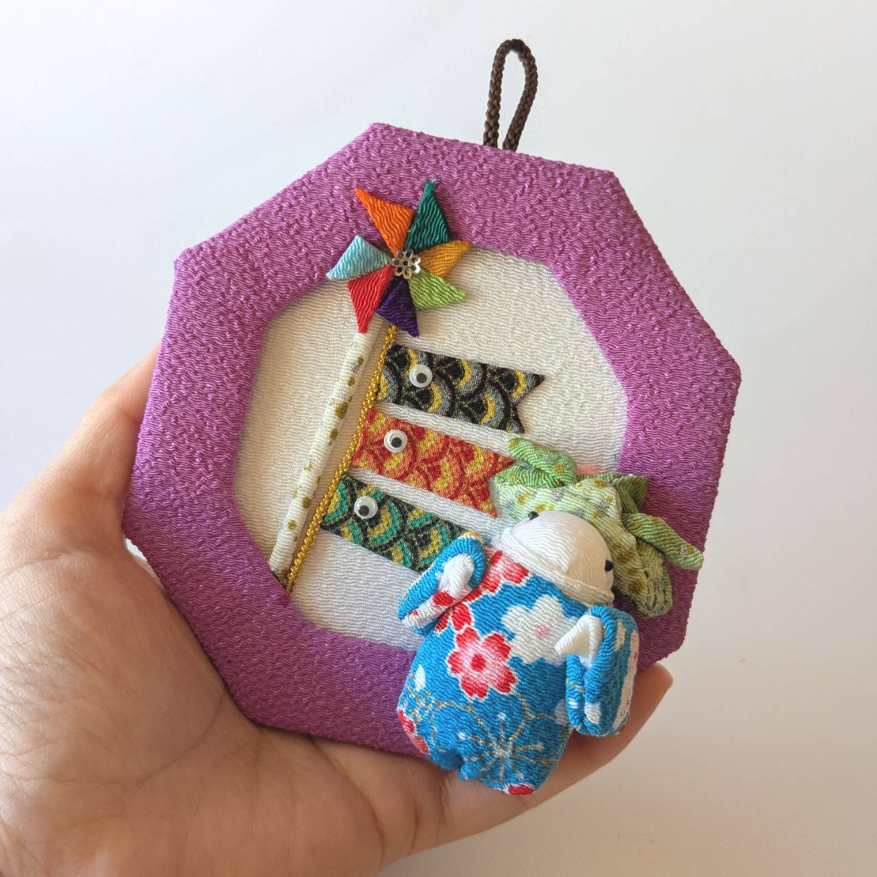 水色の着物に薄緑の兜を被った「うさくん」と、黒・赤・緑の三色のこいのぼり。 高貴な紫色のちりめんを背景に、端午の節句の賑やかさをギュッと詰め込んだ一点ものです。