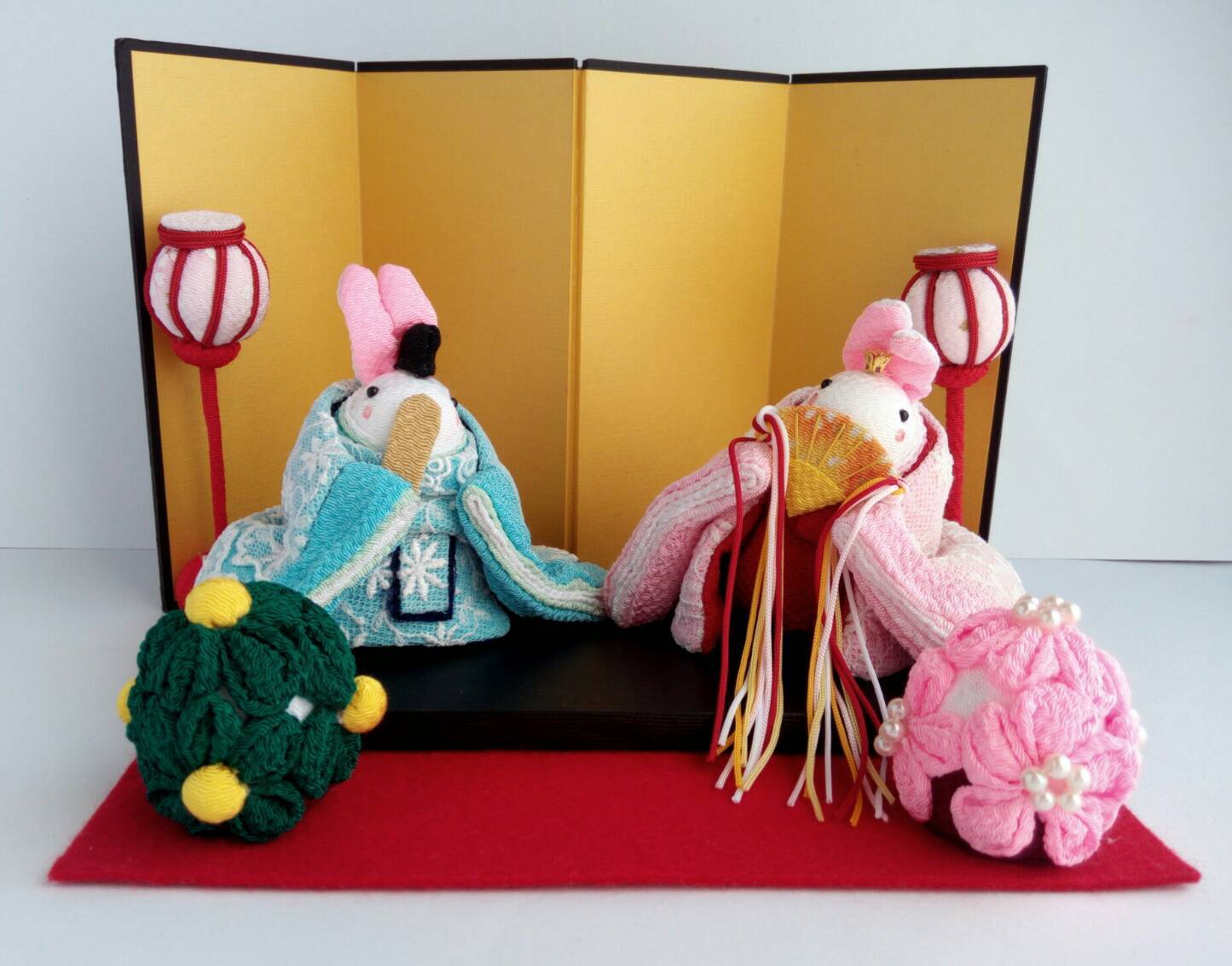 ・十二単 うさちゃん バラと小花柄レース(男雛:青、女雛:濃いオレンジ)