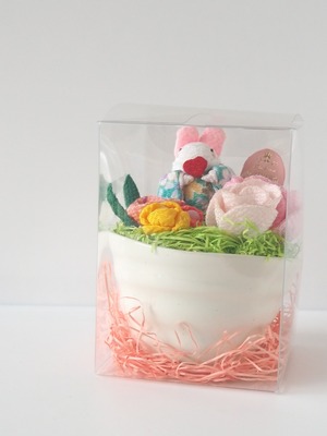 ちりめん布で作った小花やバラとハートを抱えたチビうさちゃんを白い陶器ににアレンジしました