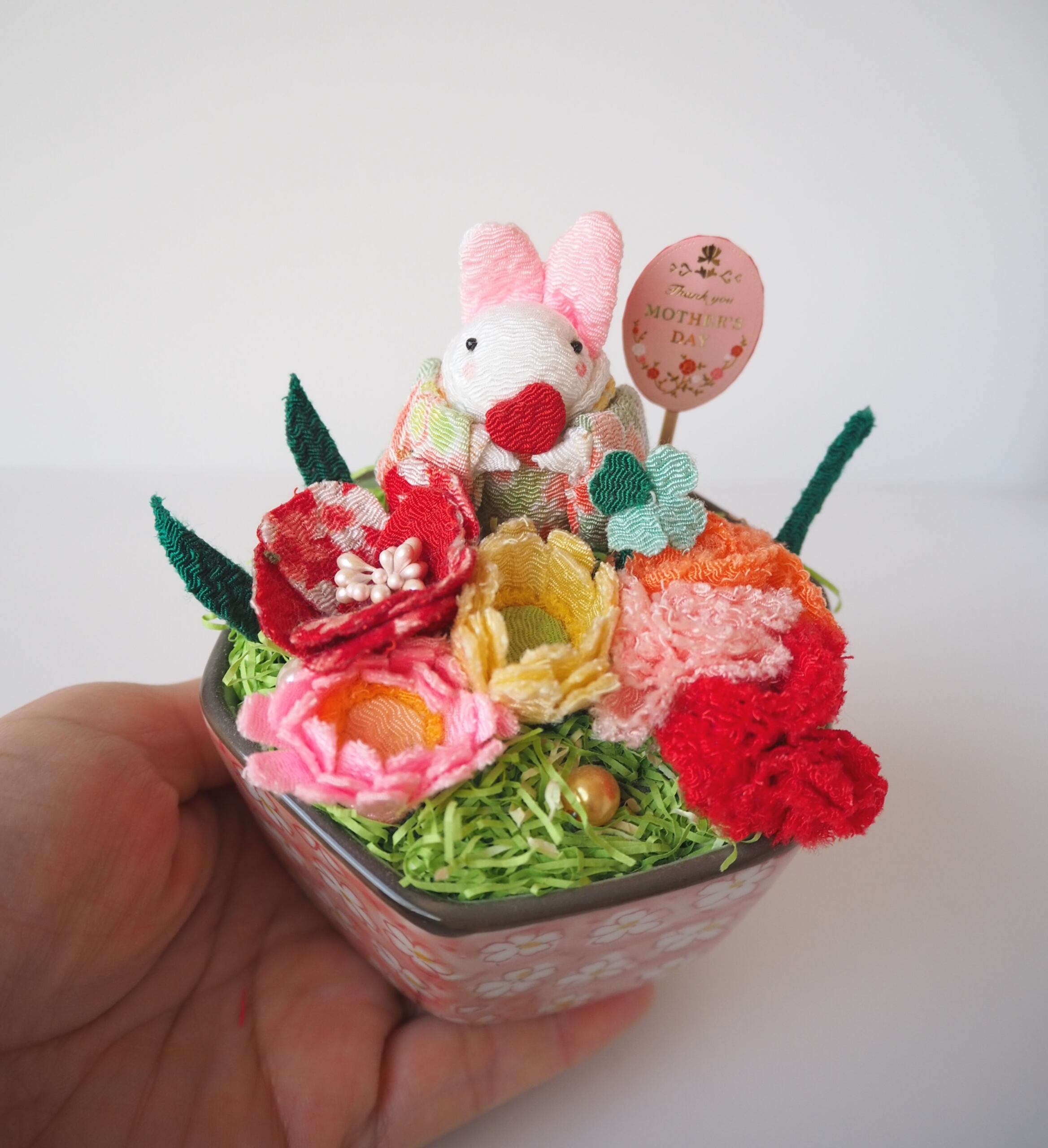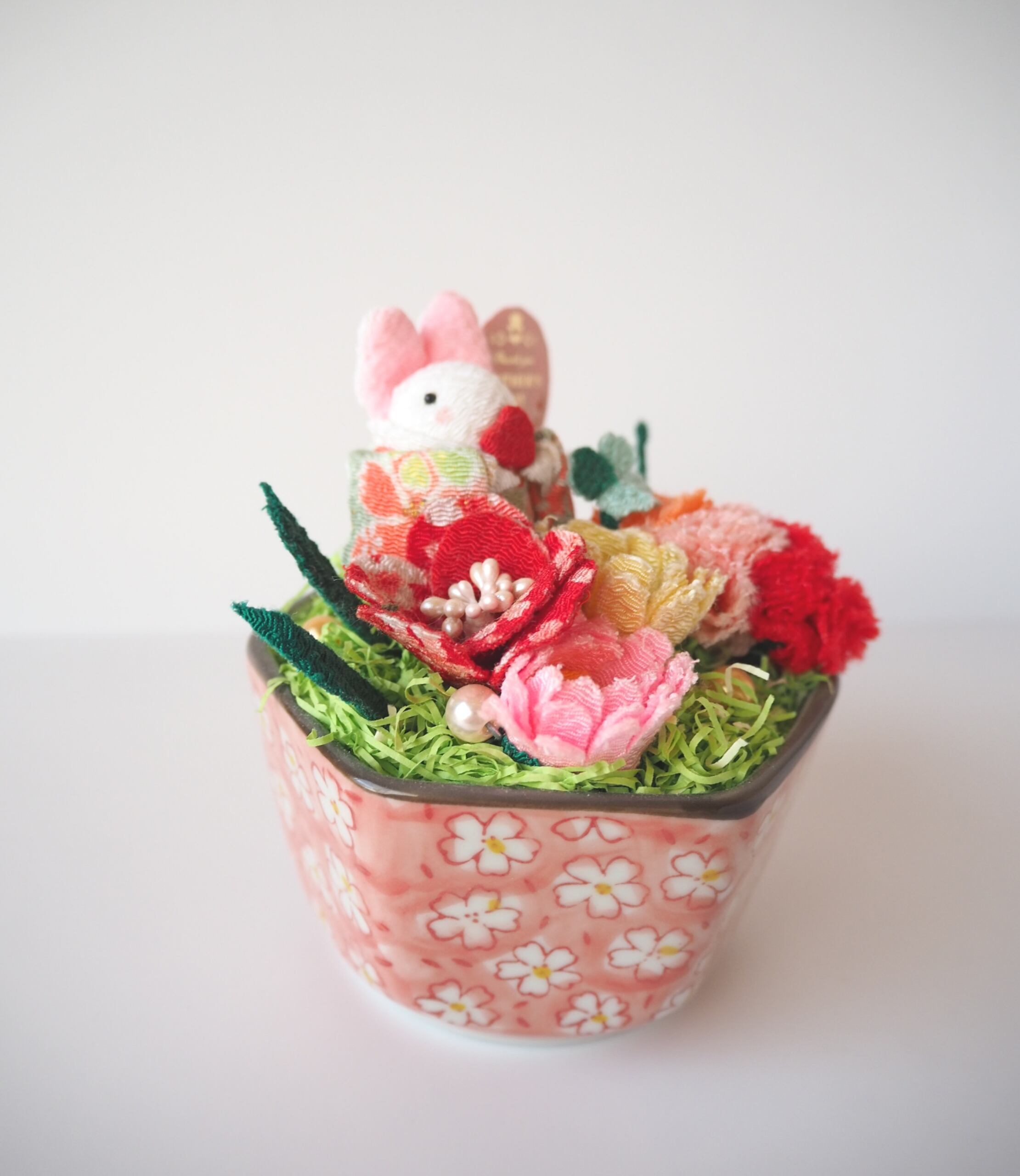 ちりめん布花とチビうさちゃんの八角形花柄陶器アレンジ