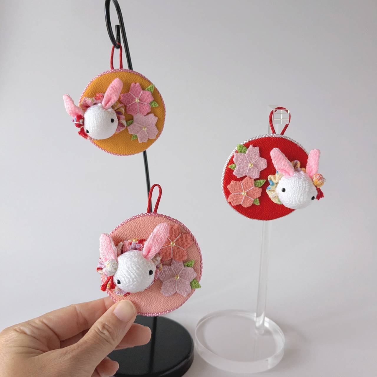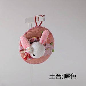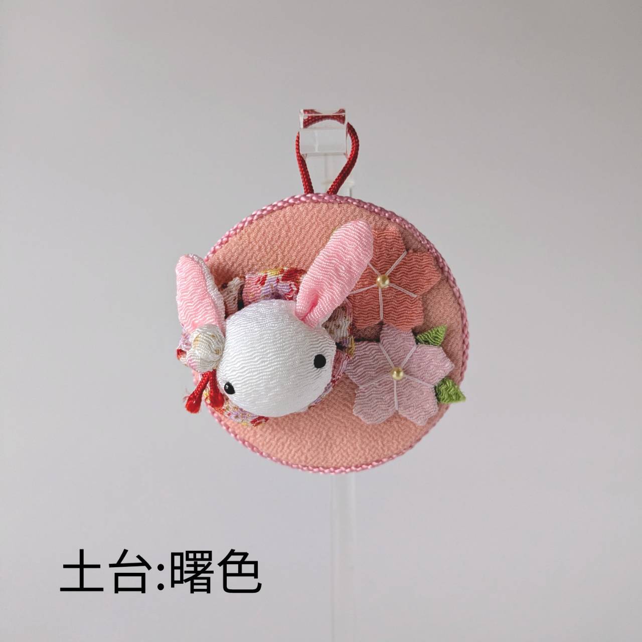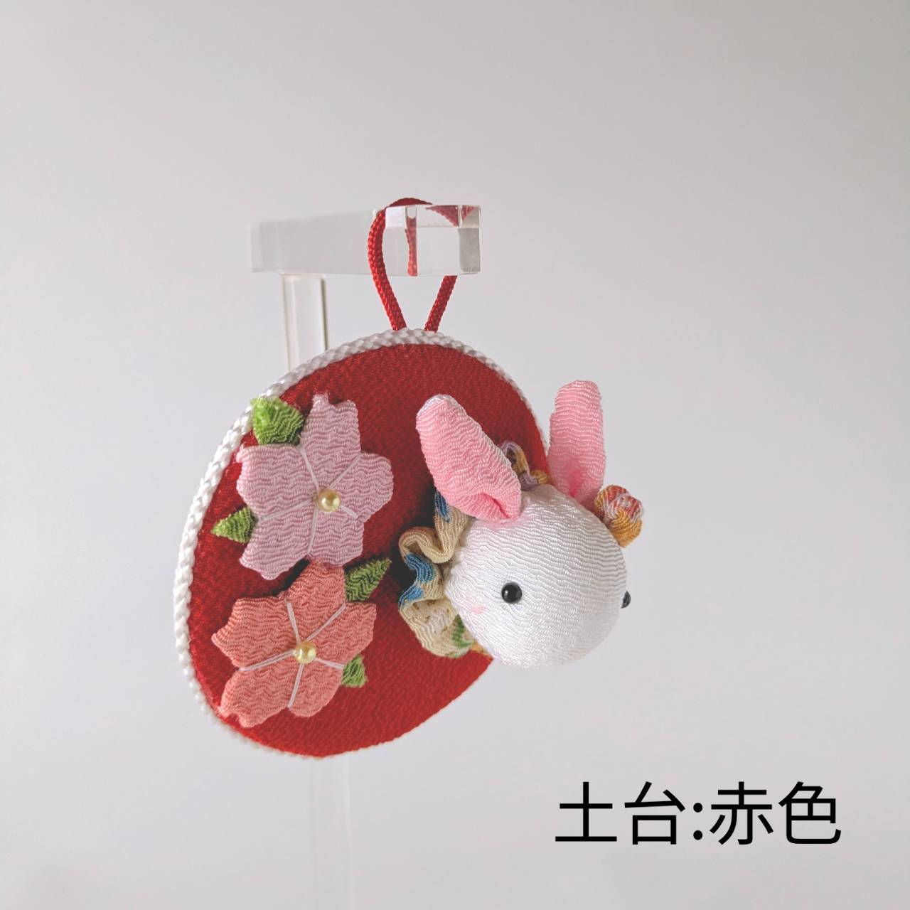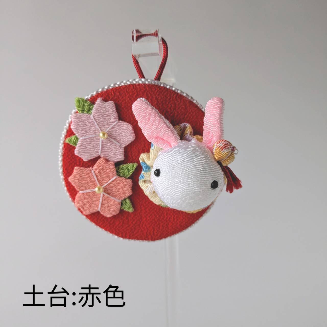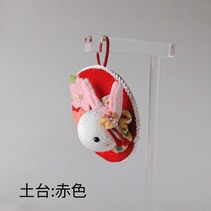 うさぎ:頭に赤色の髪飾りと顔周りにピンク地のちりめんの飾り