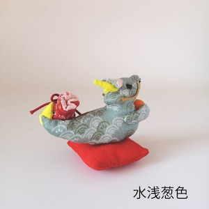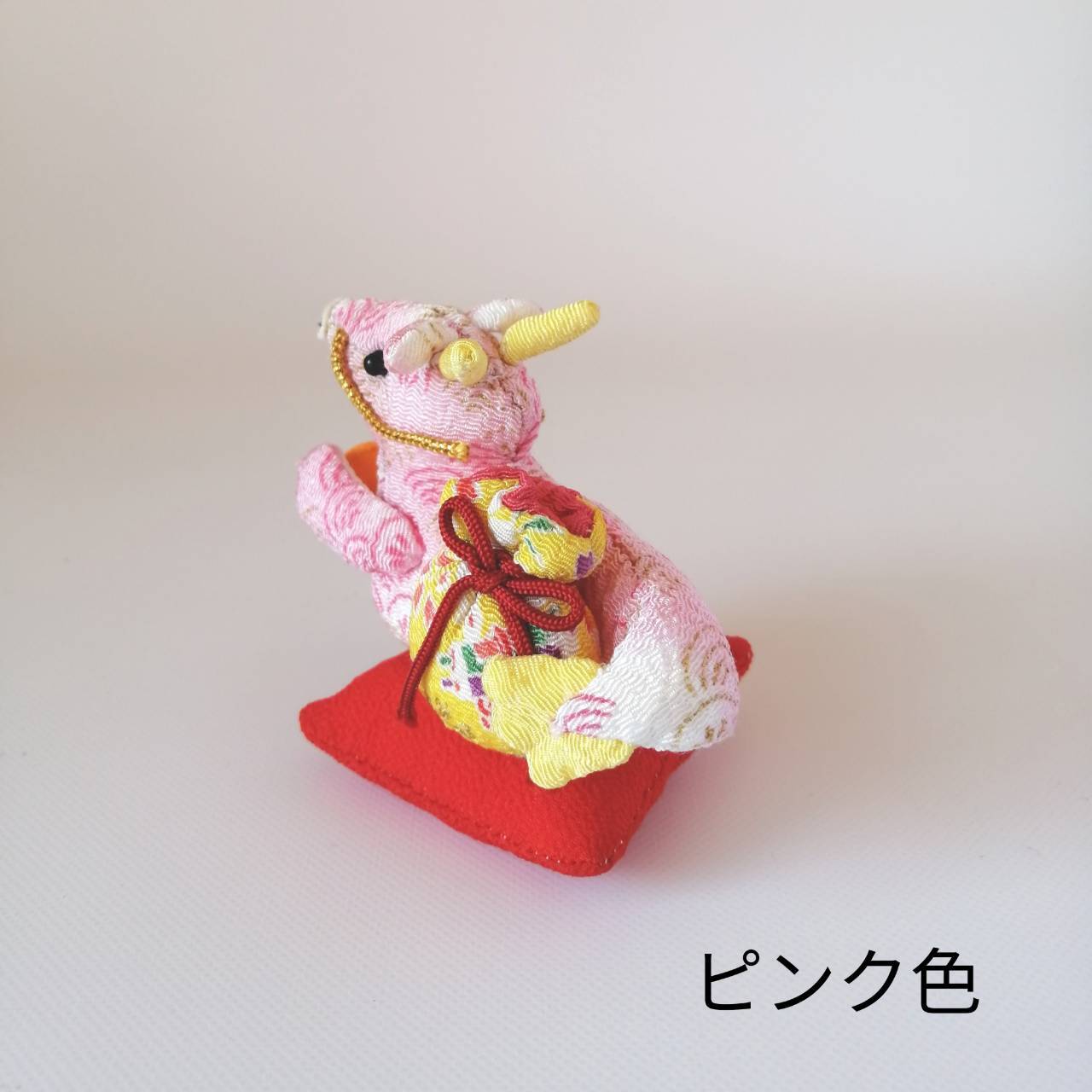 ピンク色、水浅葱色、きなり色の3色の青海波柄のちりめんを使って辰の置物を作り赤い座布団に座らせました。